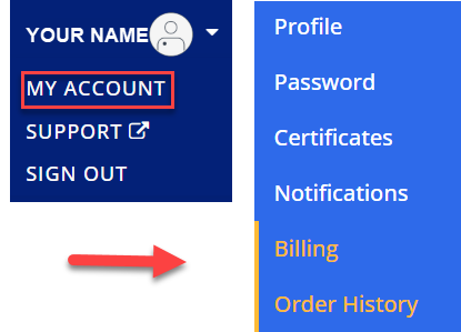 - Review your billing details under My Account (in the drop-down menu on your dashboard) → Billing or Order History.